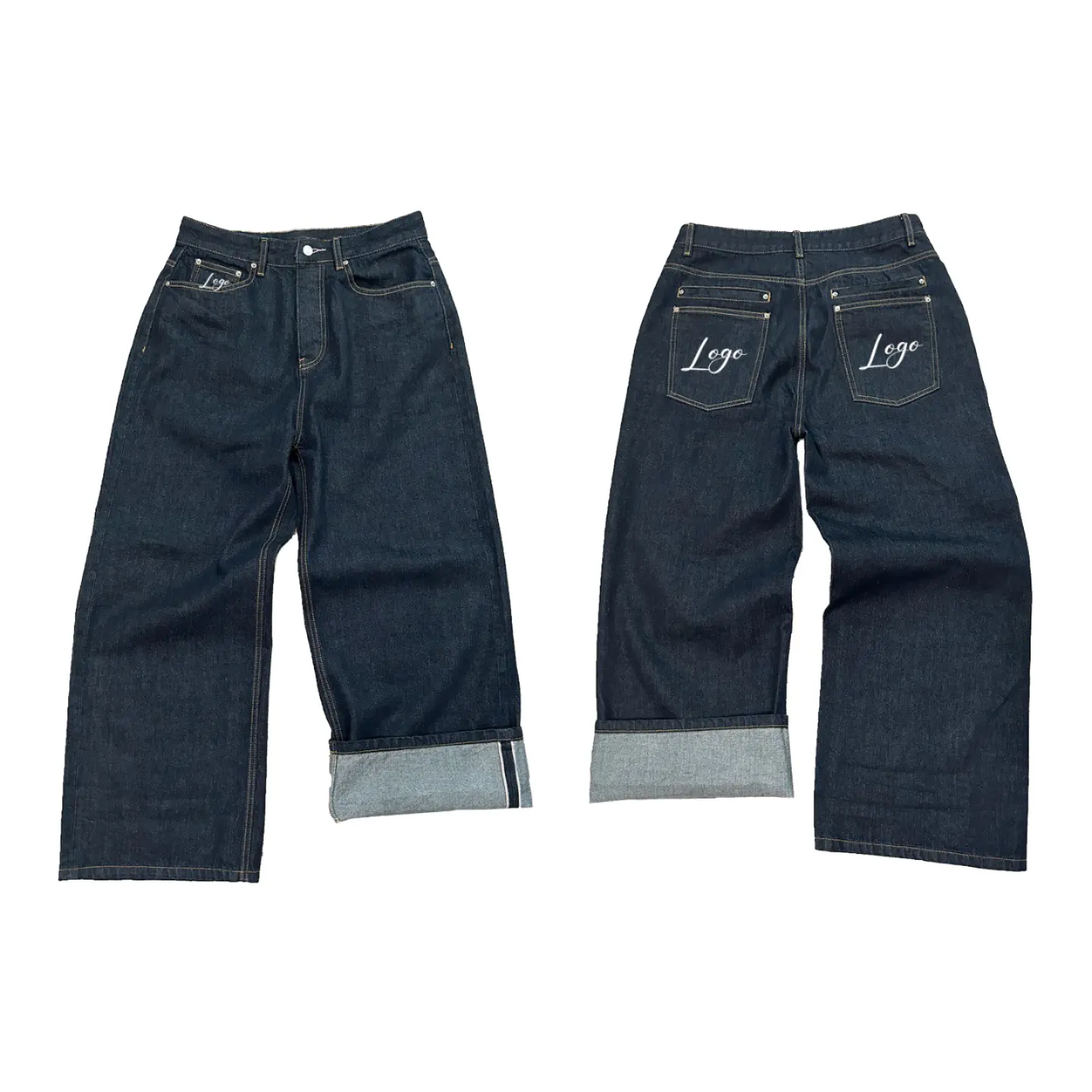 High Streetstyle Baixo MOQ Lavado Personalizado Bordado Imprimir Logotipo Solto Fit Raw Japonês Selvage Vintage Baggy Selvedge Denim Jeans